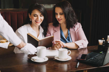 businesswomen sit in a cafe, drink coffee and have a business conversation, discuss business and have fun.
