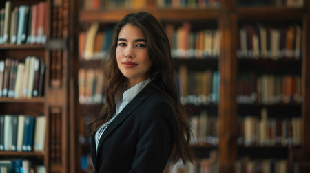 lovely female librarian with an intense gaze, holding a book while standing in front of a bookcase filled with books of different colors