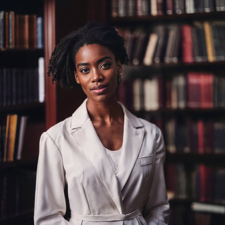 beautiful african american black woman with library in background, generative AI