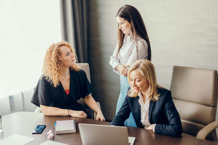 Successful coworkers talking, holding papers and working together. Professional confident office employees standing at table with laptops in conference room. Business, teamwork and management concept