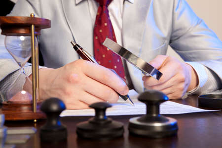 A lawyer or notary puts a seal on the document. A stamp in a mans hand.