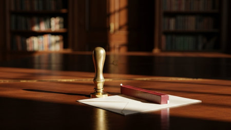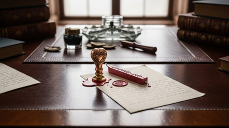 A cinematic wide environmental shot (16:9) capturing an official brass wax seal stamp and red sealin