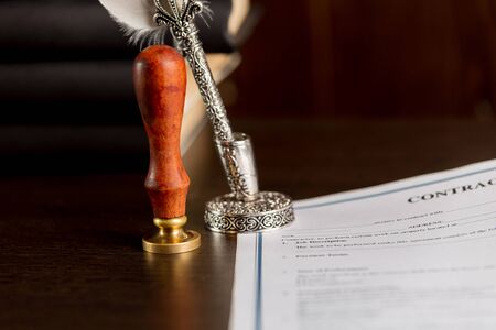 Notary and law concept. Stamp and pen on the desk in the cabinet.