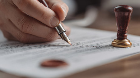 A hand holding a stamp above a document, possibly for approval or official validation on a wooden surface