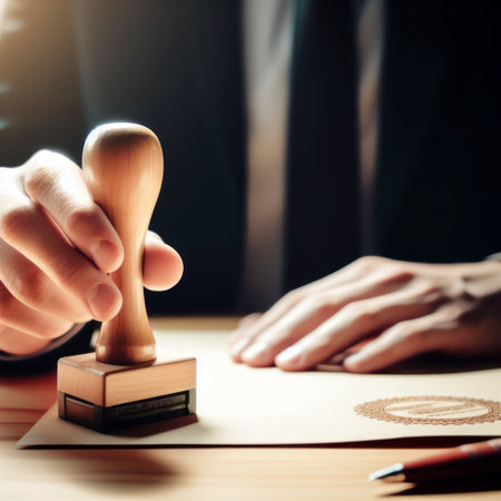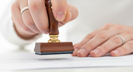 Close-up of a persons hand stamping with approved stamp on certificate document public paper.