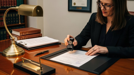 A focused shot captures a professional woman in a dark blazer seated at a traditional wooden desk. She is in the process of stamping an important document with a self-inking rubber stamp. The desk is furnished with a classic brass banker's lamp, a stack of hardcover books, and a pen. The background suggests an office or study setting, creating an atmosphere of professionalism, authority, and meticulous attention to legal or financial details.