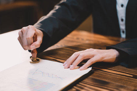 Business man person's hand stamping with approved stamp on certificate document public paper at desk, signing on business partner paper to success, or concept of attorney and insurance