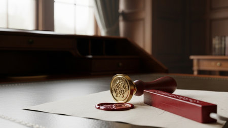 A man in a suit applies a red wax seal to an official document on a wooden desk, symbolizing authentication and tradition.