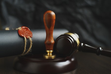 Judge's gavel, books, parchment scroll with seal and stamp on an old wooden table