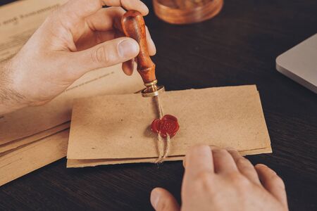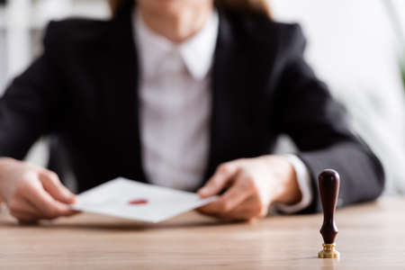cropped view of lawyer with stamper and envelope with wax seal on blurred background