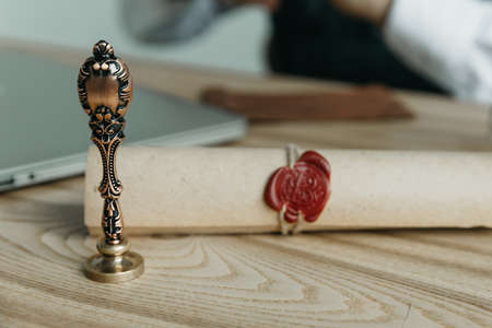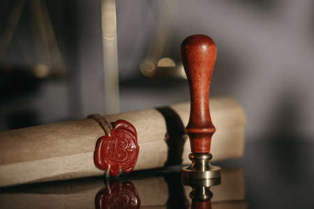 Scroll with wax seal stamp of notary public on a table