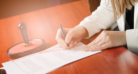 Woman Notary Public signing the contract in her office. Law office