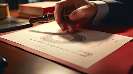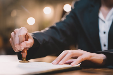 Close-up of a notarys hand stamping with approved stamp on certificate or document public.