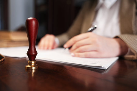 Notary public with stamp working in office, closeup