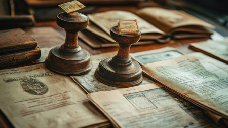 A captivating scene showcasing vintage wood stamps placed on aged documents, surrounded by historical books, creating an inviting atmosphere filled with warmth and charm.