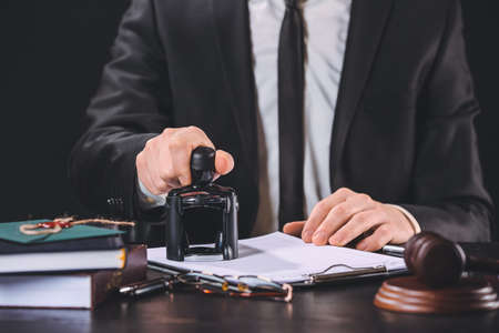 Male attorney stamping document. Seal on notarized paperwork