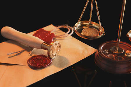 Document with wax seal, scales and antique stamp on a desk. Last will and legacy concept