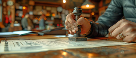 Person using a rubber stamp a document, approval, certification, or official validation in financial. Represents legal, business, or government paperwork.