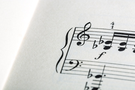 Detail view on music sheet with black notes on the white paper. The sheet is written for piano.
