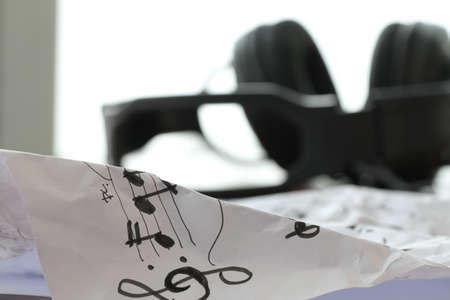 Sheets with music notes and headphones. Compose music concept