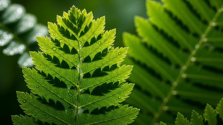 Fern showing close-up of a vibrant green fern leaf with water droplets and shadow patterns. resolution use.