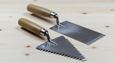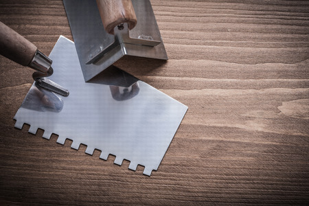 Trowel and spatula on a wooden background, construction tools
