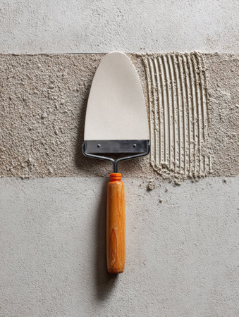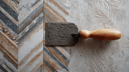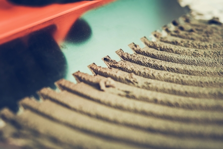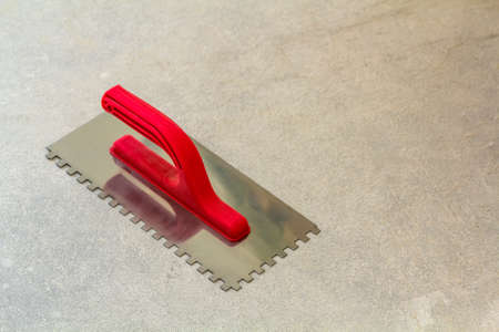 Spatula is lying on a concrete surface where adhesive is spread, showing a clean pattern design perfect for tiling tasks in remodeling work.