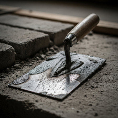 Close-up photograph highlights a hand clad in a dirty work glove expertly spreading wet mortar with a steel trowel, creating grooved textures in the cement.
