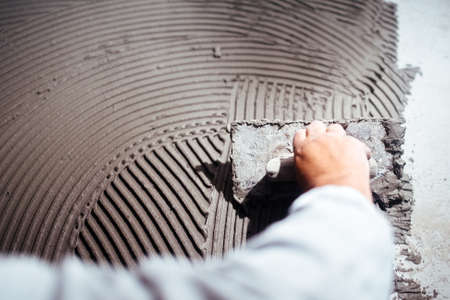 Construction worker is tiling at home, tile floor adhesive