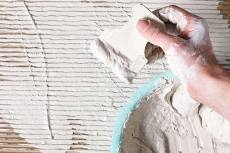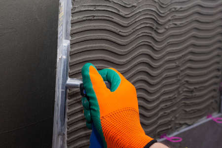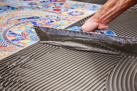 industrial close up of worker hand adding adhesive for ceramic tiles installation