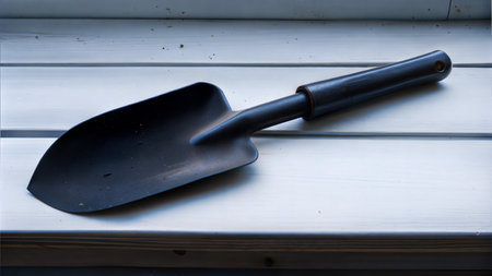 A black metal garden trowel rests on a white wooden surface. The trowel shows signs of use.