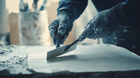 Unrecognizable worker with white plaster, dirty hand with spatula. Construction renovation background with free space for text.