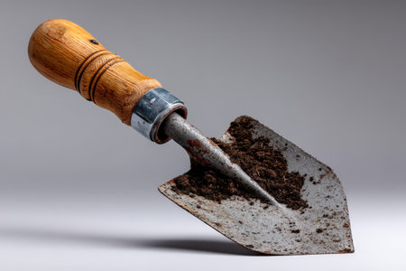 A metal hand trowel with a wooden handle rests on a smooth surface holding fresh soil.