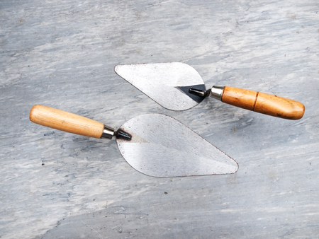 Trowel and trowel tools on cement floor background.