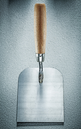 Construction trowel tool at cement background. Mason tools on concrete wall