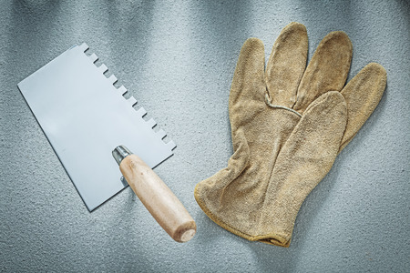Bricklaying trowel working gloves on concrete surface construction concept.