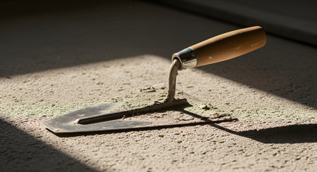 Plastering tools, a trowel and bucket on plywood, bathed in soft natural light, create a calm working atmosphere.