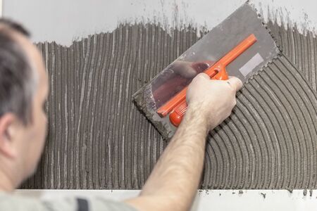 A male tiler manually glues ceramic tiles to the bathroom wall. Aligning the adhesive on the wall for gluing the tiles. The builder attaches the tiles to the wall with cement.