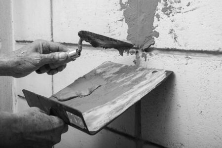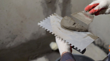 Construction worker is putting cement on a notched trowel using a spatula, preparing to apply it on a wall during a renovation or construction work