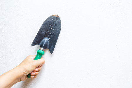 Girl hand holding old trowel with space on white cement wall background, gardening tool