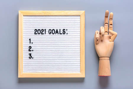 Text - 2021 goals Motivational quote on message felt board, wooden hand on gray background Planning, self motivation, achievement, success, wish list, checklist concept Top view Flat lay.