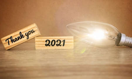 Image with thank you 2021 text on wooden blocks with bright light bulb background. Conceptual