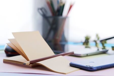 School stationery, tablet, phone on the desk, home schooling concept