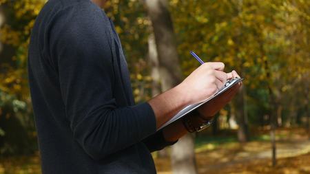 A man with documents in their hands in their black shirts on the street with a pen in his hand