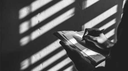 Focused individual jotting down plans and notes in a diary, with a blurred background hinting at a cozy environment