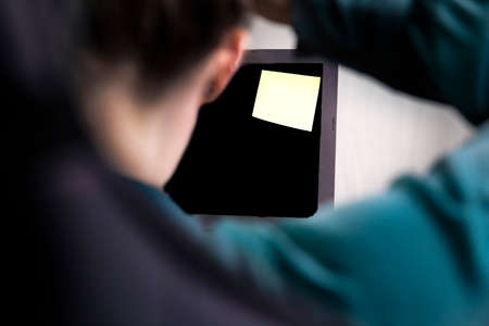 Business woman work from home with blank sticky post on computer for reminder business, home office closeup copy space modern design
