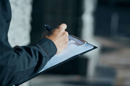 Man hands writing clipboard at farm facility closeup. Livestock manager work. Unrecognized agricultural specialist professional breeder making notes in cowshed building. Modern agribusiness concept