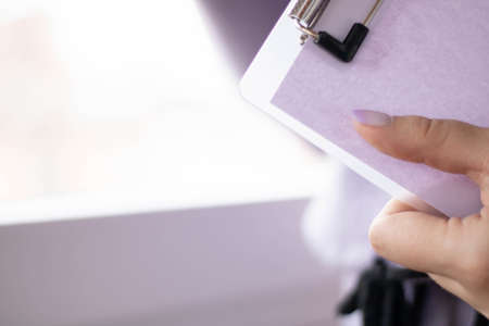 Woman hand writing down in small white memo notebook for take a note not to forget or to do list plan for future.