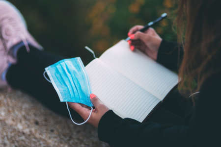 Side photo of blank notebook in female hands together with a pen and blue medical mask on left hand, sitting in a park. Life after quarantine of epidemic pandemic. New reality. Space text