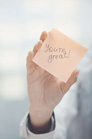 The hand holds a sticky note with inscription Stay focused. motivational statement.